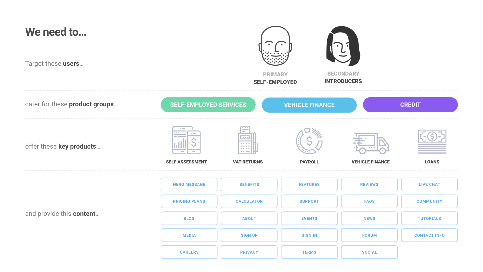 To get an understanding of the current state of affairs, I first had to get myself up to speed on what the company did, the services they offered, where they were going and what competition they had. Luckily I had direct contact with some key stakeholders and senior staff, so this part was pretty painless.